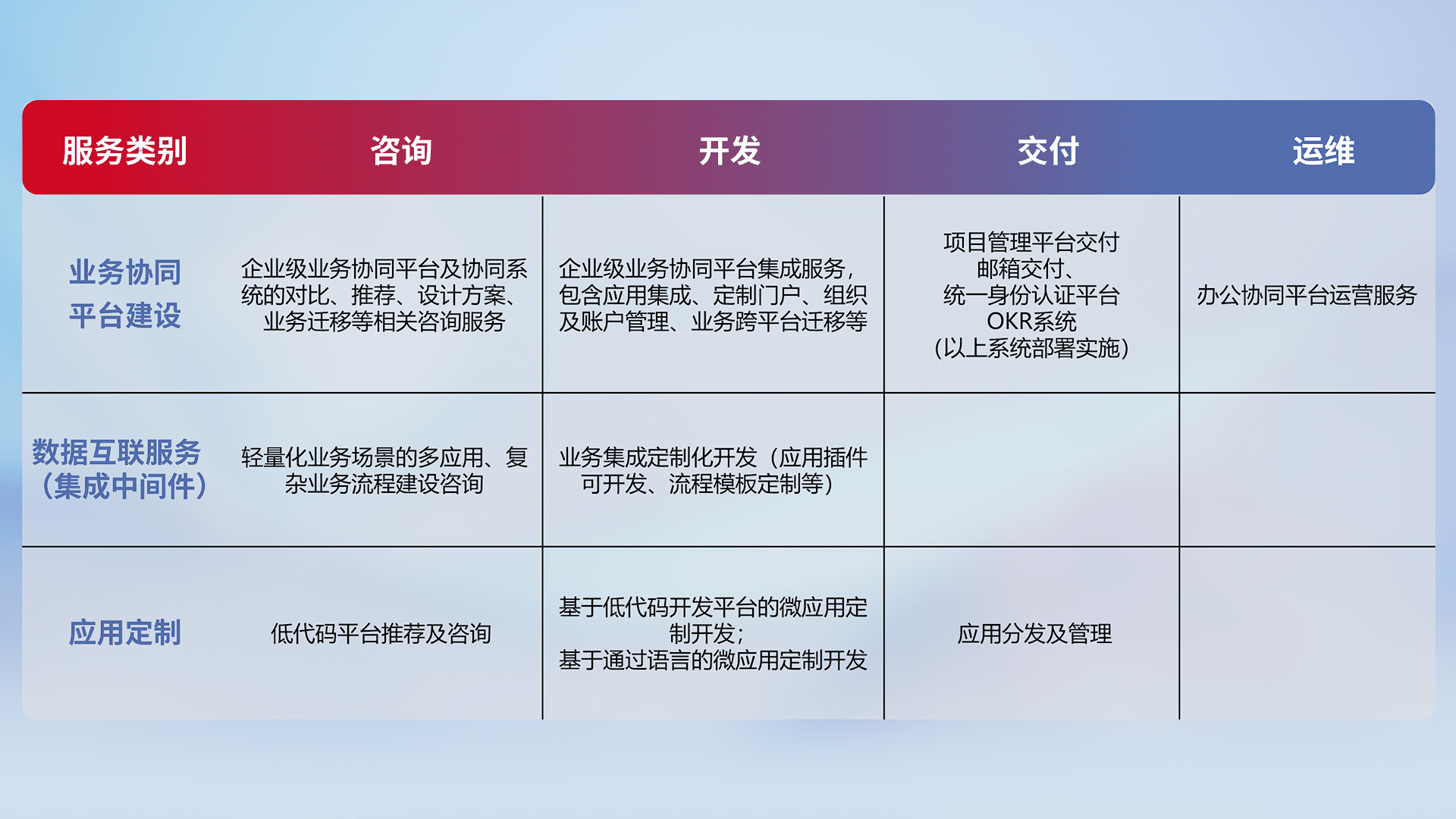 针对钉钉、、、企微、、、IDaas等平台级产品提供产品的规划、、方案、、、、交付、、、、定制化开发等服务,,实现如统一协同办公、、、、智能客户服务、、、、混合会议管理、、智能数据查询、、、等业务场景,,,实现数字化转型。。。。