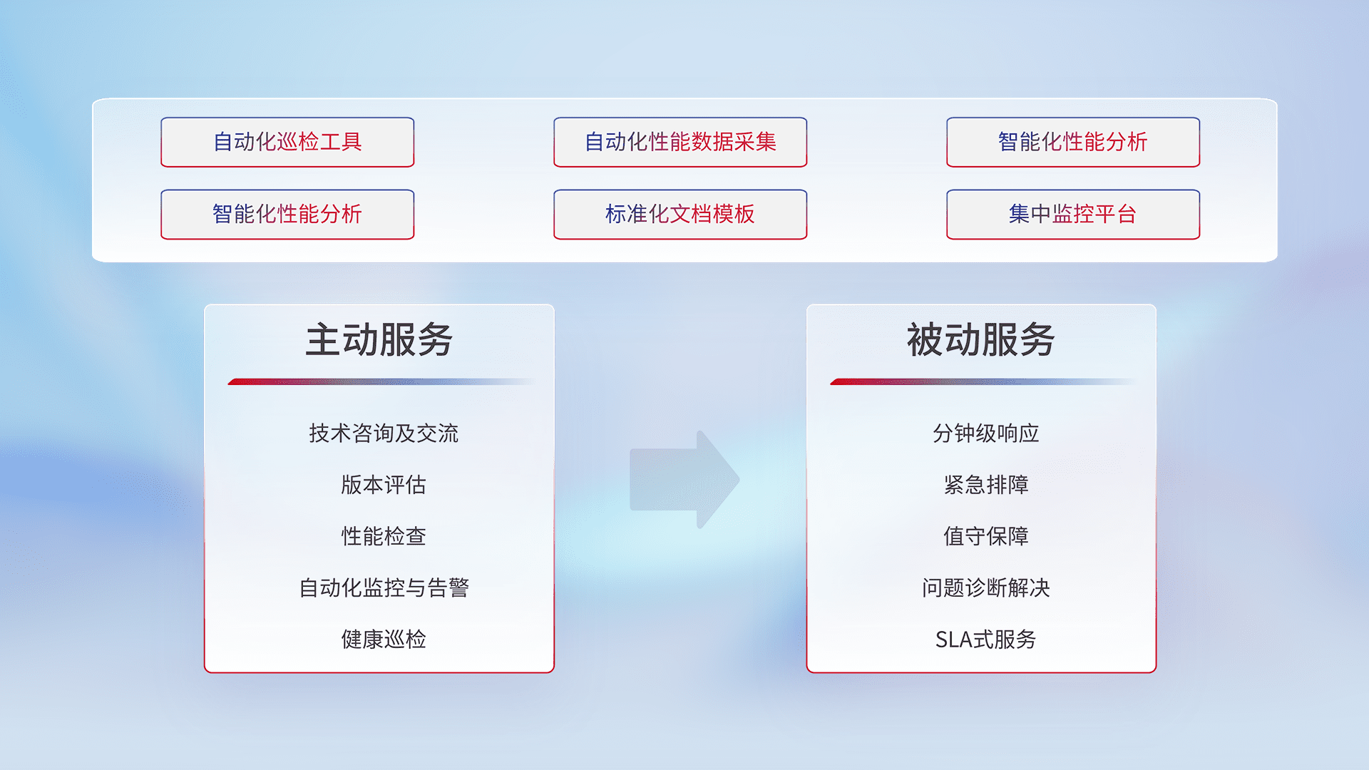 智能化工具和标准化文档,,,保障服务质量,,,提供主动服务(包含技术咨询、、、版本评估、、性能检查、、、自动化监控与告警、、健康巡检)和被动服务包含(分钟级响应、、紧急排障、、、值守保障、、问题诊断解决、、、、SLA服务)。。